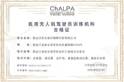 黑龙江科大格羿创新科技有限公司是中国民用航空局认定的黑龙江省民用无人驾驶航空器操控员执照唯一考试点,具有旋翼-多旋翼、旋翼-直升机、飞机、垂直起降飞机类别和视距内操控员、超视距操控员及教员等级的培训资质。